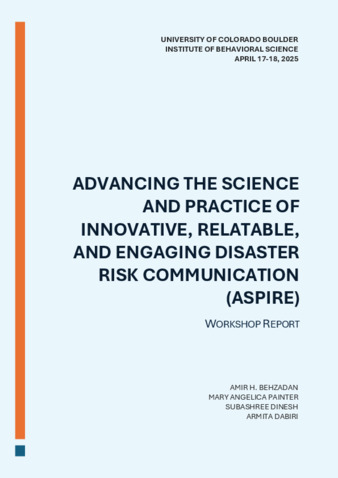Painter, Mary Angelica, Subashree Dinesh, Amir Behzadan, and Armita Dabiri. 2025. Advancing the science and practice of innovative, relatable, and engaging disaster risk communication (ASPIRE). Institute of Behavioral Science, University of Colorado Boulder.