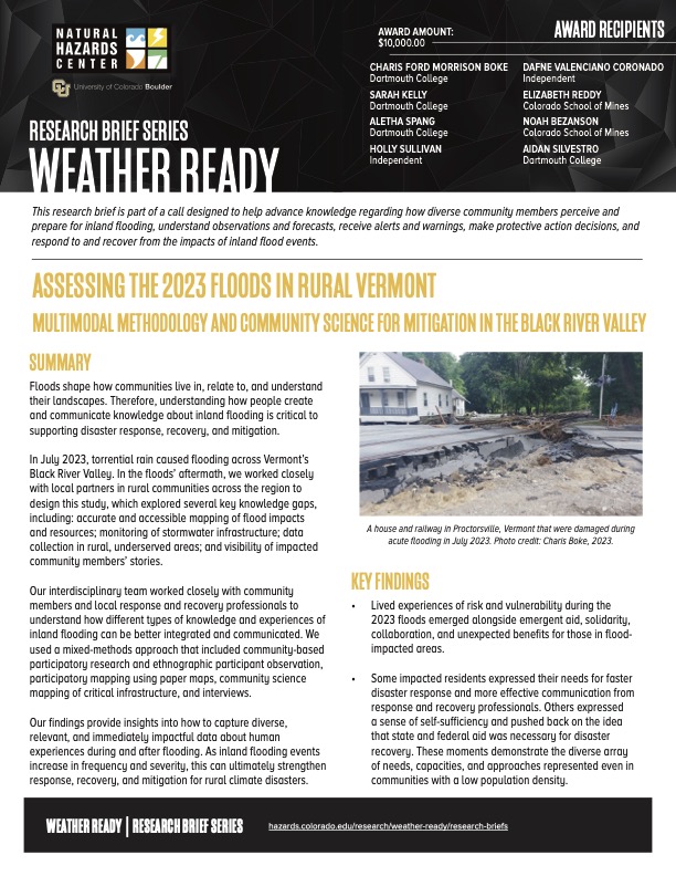Boke, C. F. M., Kelly, S. H., Spang, A., Sullivan, H., Valenciano Coronado, D., Reddy, E., Bezanson, N., & Silvestro, A. (2025). Assessing the 2023 Floods in Rural Vermont: Multimodal Methodology and Community Science for Mitigation in the Black River Valley. (Natural Hazards Center Weather Ready Research Report Series, Report 17). Natural Hazards Center, University of Colorado Boulder. https://hazards.colorado.edu/weather-ready-research/assessing-the-2023-floods-in-rural-vermont