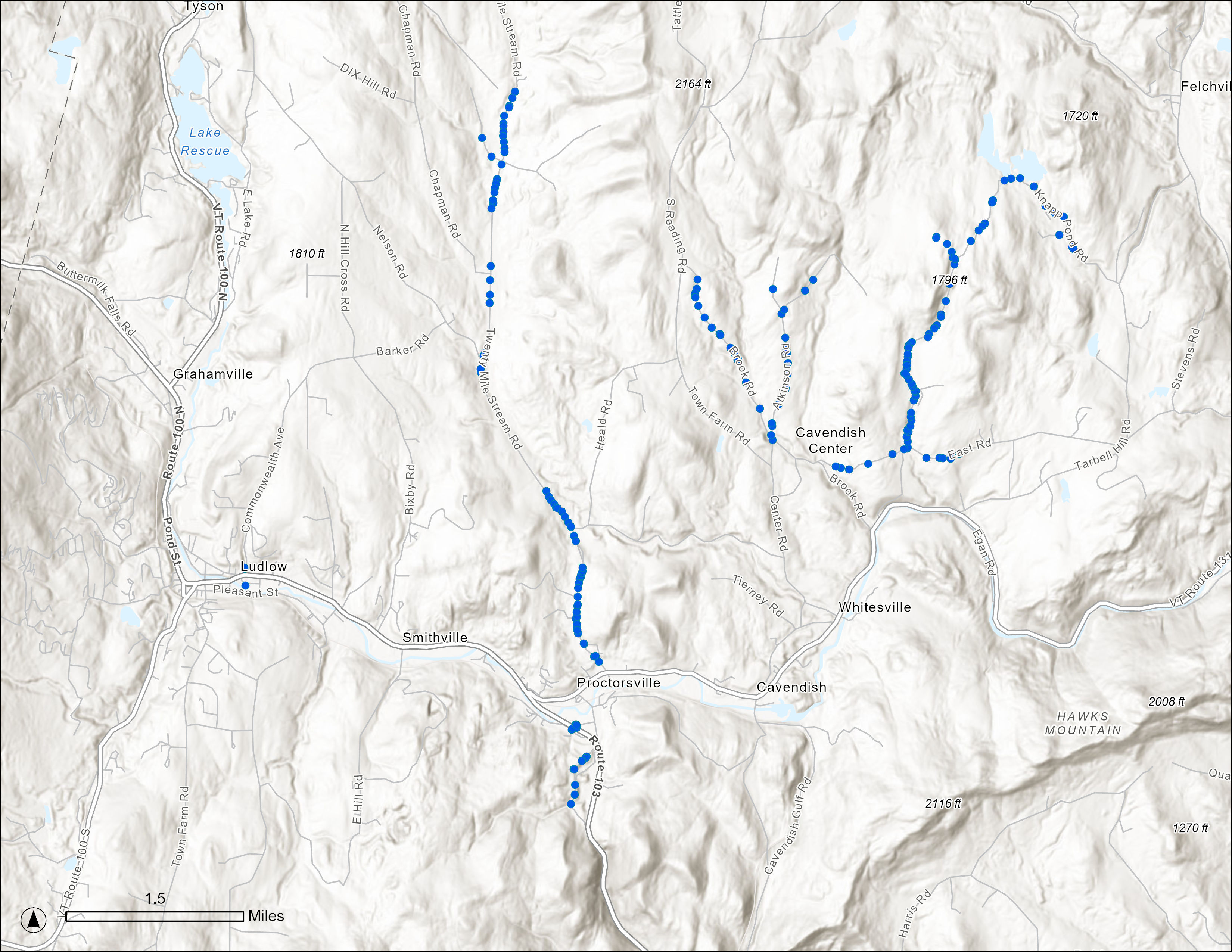At the Mt. Holly Energy Fair, 12 residents stopped at the table to talk about their flood experiences and draw points on the map to visualize locations where these events had occurred. At the Ludlow Farmers’ Market and the Community Luncheon, twenty-two residents participated in this event and contributed 45 different data points. At the Cavendish Tag Sale, the research team interacted with approximately 15 people. While only five points were mapped, the mapping method elicited in-depth conversations with public works employees and residents with extensive knowledge of stormwater and road infrastructure maintenance.